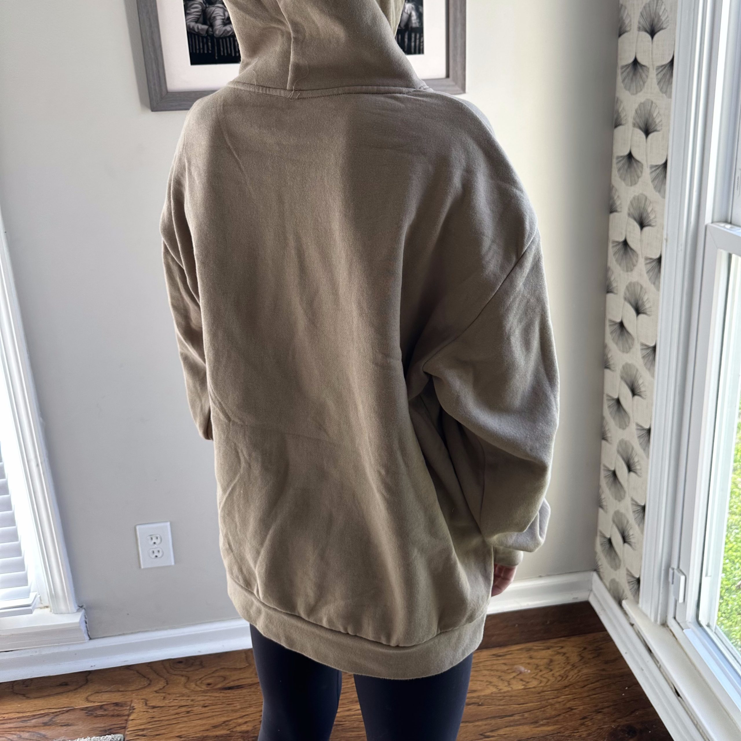 Cozy oversized tan hoodie with the bold “Doing WRC” (Walk. Run. Coffee.) graphic in blue. Soft, warm, and perfect for workouts or everyday wear.